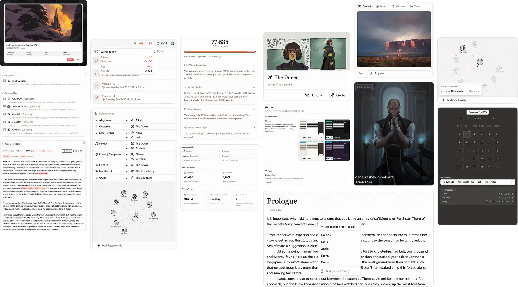 An editor that grows with your story, with all the features you need to write and worldbuild.